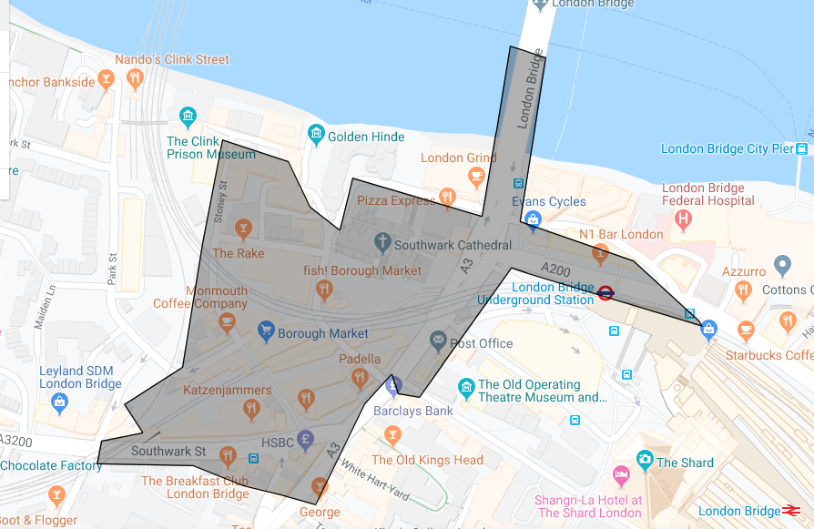 A wide police cordon was in place this afternoon, extending down Borough High Street on the south side of the river.