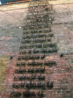 In Bermondsey he has placed a text from Charles Dickens' novel Pickwick Papers high up on a wall. At night the words can be seen not only from the Leathermarket but at a distance from Guy Street Park and Leathermarket Gardens.