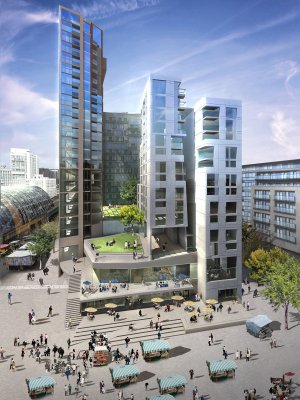 The 15 storey northern tower will front onto the New Kent Road and will house a new 214-room hotel. The third southern tower comprises 12 storeys of 46,000 sq ft of residential accommodation overlooking the new market square.