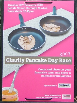 The Financial Times, the London Marathon organisers, Southwark News, Southwark Cathedral, Fourth Day Public Relations and Vinopolis were among businesses and institutions entering teams in the first Better Bankside charity pancake race.