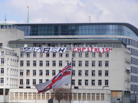 The only hint of a demonstration was at More London where from the offices there was a view across the river to Brewers Quay where a giant banner read 'smash capitalism'.