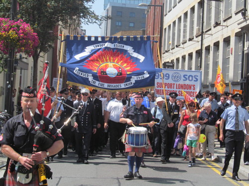 Led by an FBU-sponsored pipe and drum band from Humberside, the march crossed London Bridge and made its way along Southwark Street and Blackfriars Road to reach the London Fire Brigade headquarters in Union Street.