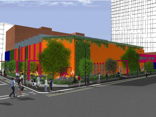 The blank brick 1970s facade of the Greenwood Theatre will be brightened up this summer thanks to a collaboration between fashion designer Zandra Rhodes and TV presenter Joe Swift.