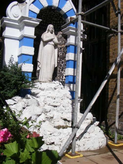 The shrine of Our Lady, the grotto in front of the church, although included in the listing is not by Walters. It was added by Mgr Anthony Reynolds who was the well-known and much loved parish priest from 1955 to 1981. For many years the tiny well-cared garden at its base provided one of the few green spaces in Bankside.