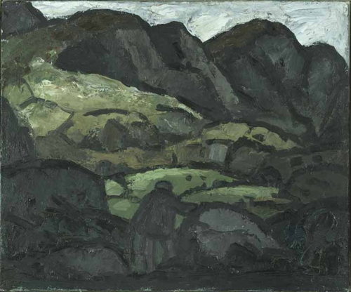 The oil on canvas painting by Kyffin Williams, entitled "Landscape at Llanaelhaearn", is dated 1947 and measures 51.1cm by 61cm.