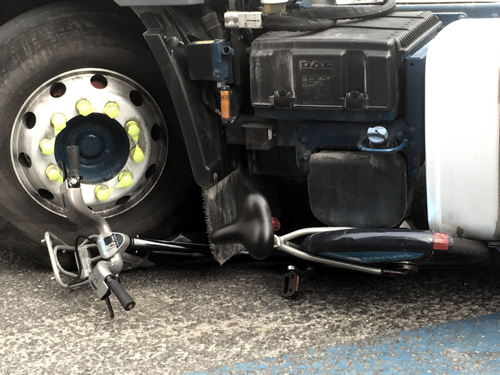 A cyclist suffered minor injuries on Friday afternoon when the bike she was riding was crushed under the front wheels of an articulated lorry.