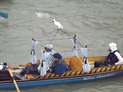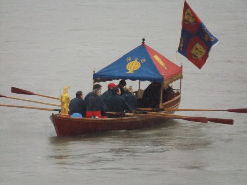 The livery craft crews had to row against an incoming tide which slowed the speed. The journey to HMS President downstream of Tower Bridge was timed to take just an hour.