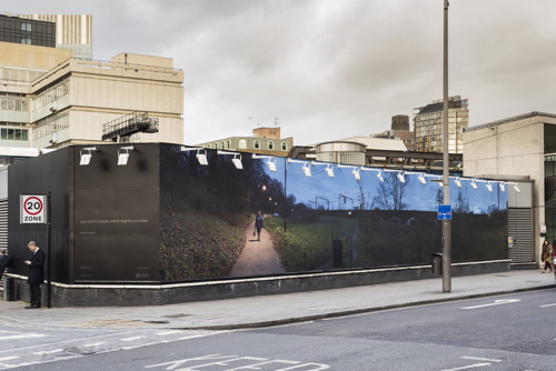 The work features two large scale photographic works displayed on the hoardings on The Cut and Blackfriars Road..