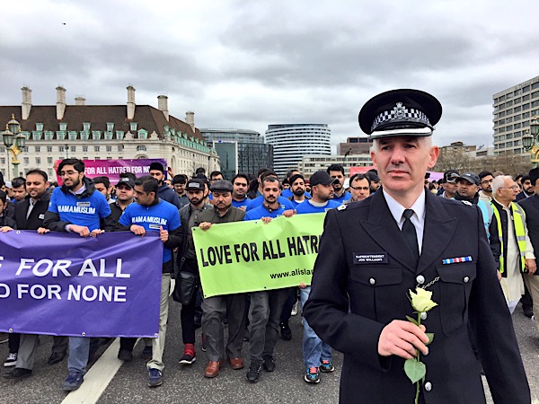 Hundreds of police officers as well as staff from St Thomas' Hospital and members of the Ahmadiyya Muslim Association took part in the commemoration, which included a minute's silence and the laying of flowers.