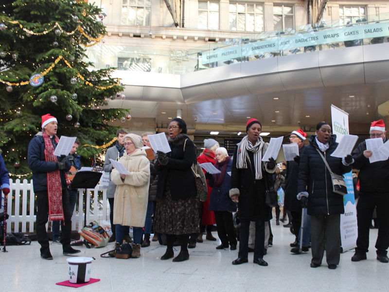 Volunteers gathered under the Christmas tree at Waterloo Station on Saturday to take part in a 12-hour 'carolathon' to raise funds to meet the running costs of the local foodbank.