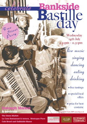 Every 14 July the streets of France come alive in celebration of the 'storming' of the Bastille and the birth of La République 1789. Once again the party atmosphere 'French style' comes to Borough Market environs with live music, song and dance, street entertainment, theatrical spectacles, give away goodies, outdoor eating and drinking and a traditional finale.